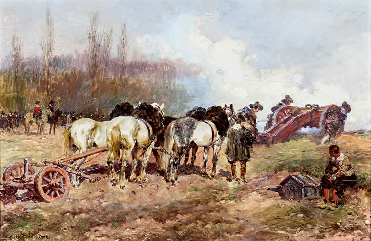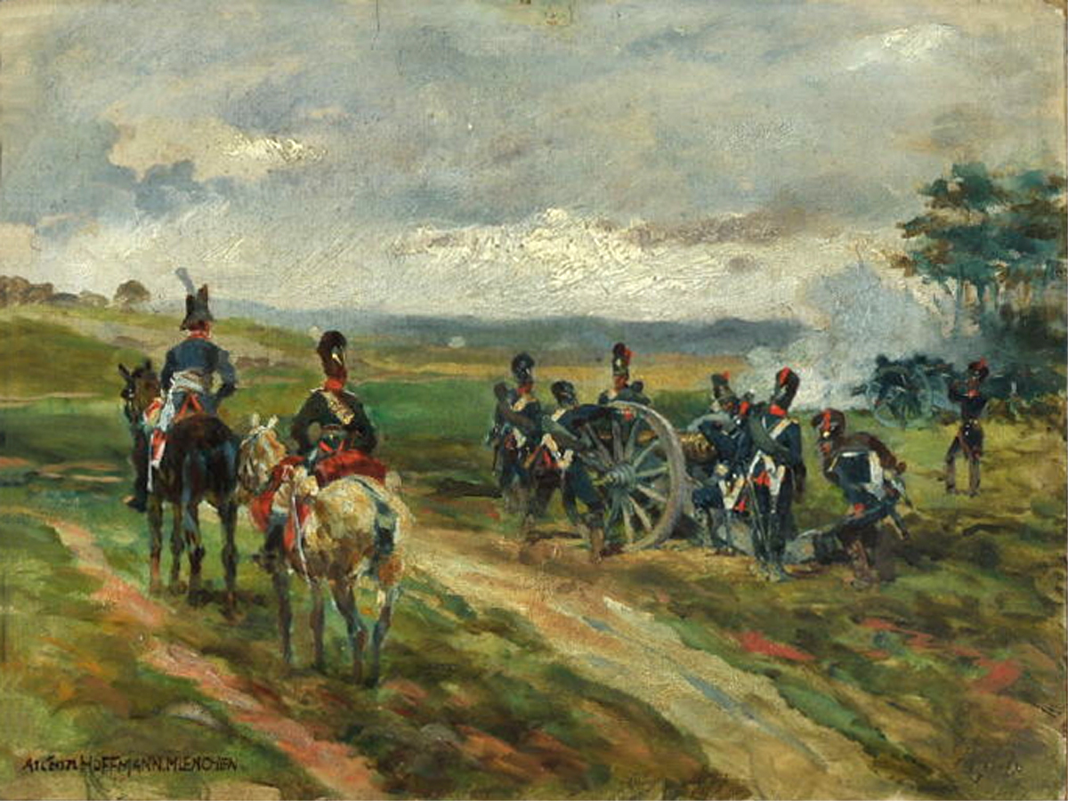 "Artillerie beim Ausrichten einer Kanone" (Kanoniere des königlich-bayerischen Artillerie-Regiments zwischen 1808 und 1811) Gemälde undatiert, versteigert in der Herbst-Auktion 2017 im |