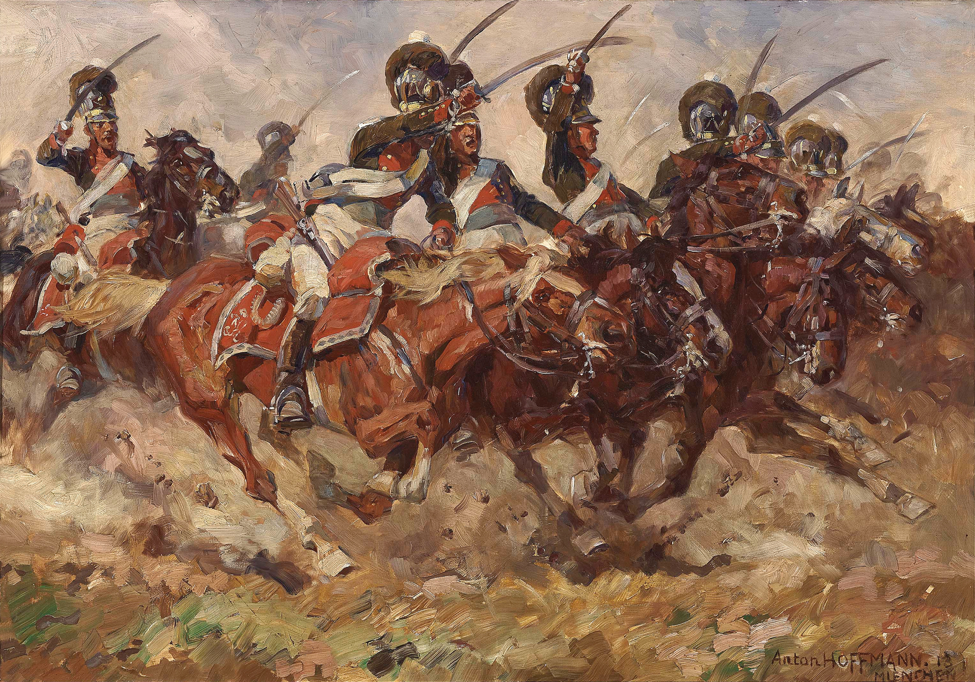 "Schlachtenszene" (königlich-bayerische Chevaulegers zwischen 1809 und 1813) Gemälde um 1913, versteigert im September 2019 bei |