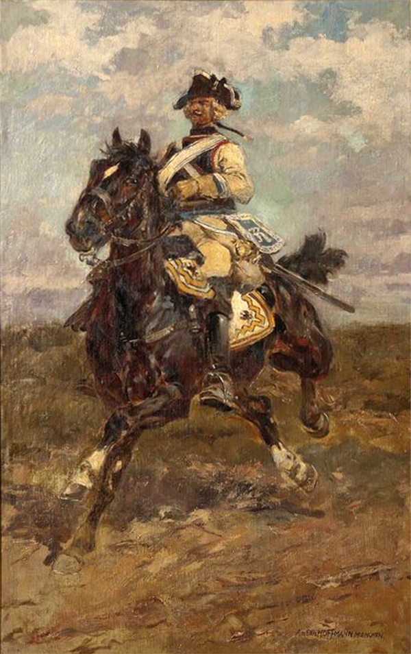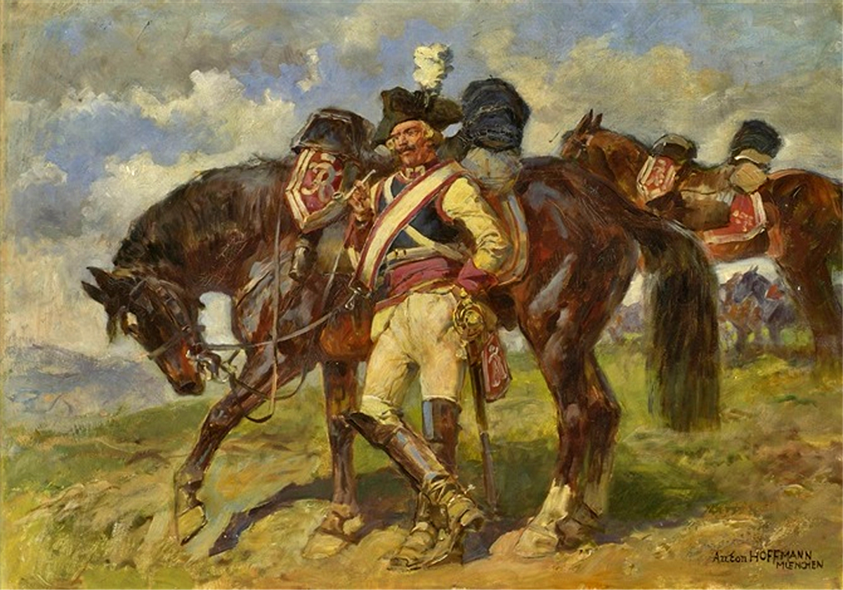 Hoffmann, AntonDeutscher Historien-, Schlachten- und Militär-Maler, Heeres- und Uniformen-Kundler, Zeichner und Illustrator; Offizier und Hochschul-Lehrer. * 10. April 1863 in Bayreuth; † 26. Januar 1938 in Rothenburg ob der Tauber Hoffmann trat im Alter von 17 Jahren als Freiwilliger in die bayerische Armee ein, erlebte während seiner Dienst-Zeit die Deutschen Kriege und wurde nach neun Jahren als Offizier der Reserve verabschiedet. Bereits während seiner Militär-Zeit hatte der zeichnerisch begabte Hoffmann seine Eindrücke aus den Kriegen in einer Vielzahl von Skizzen verarbeitet. Diese authentischen Skizzen eröffneten ihm den Einstieg in eine künstlerische Laufbahn: Hoffmann begann als Illustrator für verschiedene Verlage zu zeichnen und veröffentlichte wahrscheinlich schon zu dieser Zeit seine ersten