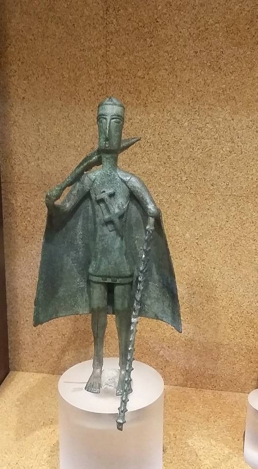 Stolzer Häuptling von Uta mit Votiv-Schwert oder –Lanze, Nuraghen-Dolch mit Gammata-Griff (Fischgrät-Muster) im Schulter-Gurt, Häuptlings-Stab mit Nieten aus Metall, Tunika mit Rock, großer Umhang Höhe ca. 395 mm; Museo Archeologico Nazionale Cagliari - Sardinien Bild-Quelle: ► Nuraghen Mediathek