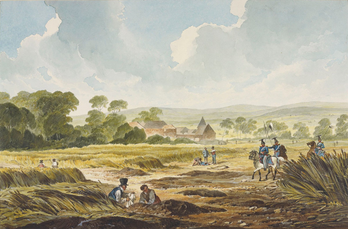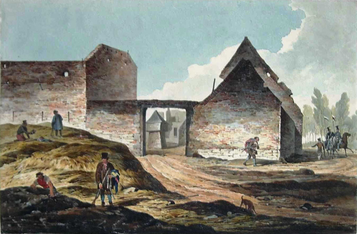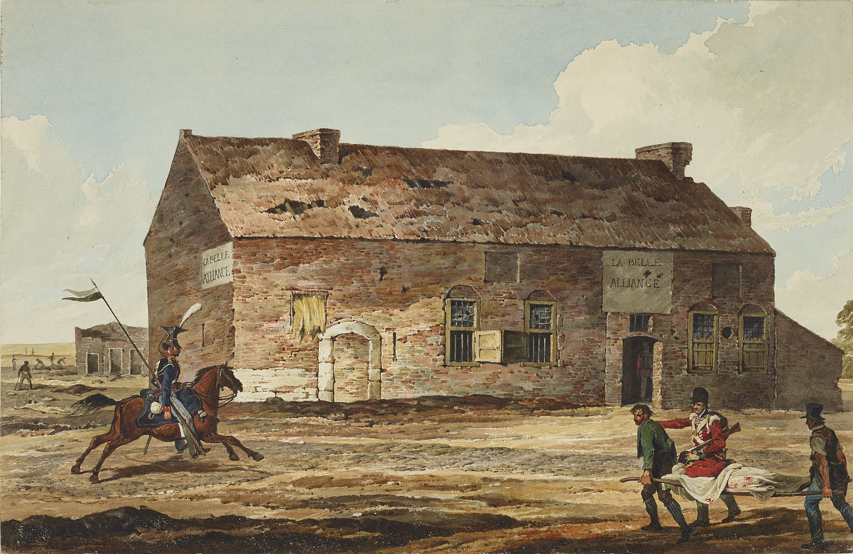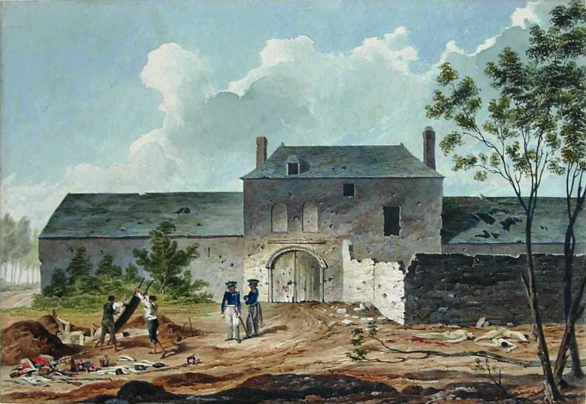 Colorierter Stich von Charles Turner (nach einer Skizze von Captain Georg Jones) aus der Serie "Views of Waterloo, Hougomont and La Belle Alliance - Mai 1816", lt. »Invaluable« im priaten Besitz.