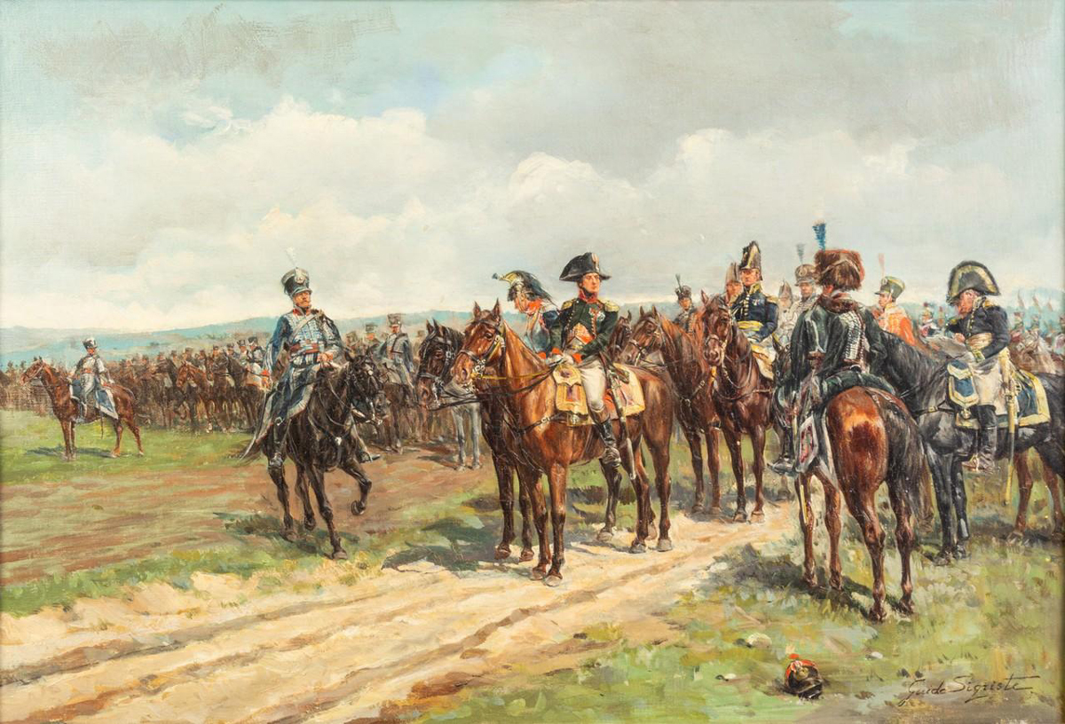Napoleon gibt seine Kutsche auf und besteigt ein Pferd. Die Garde-Jäger seiner Eskorte ziehen ihre Säbel…