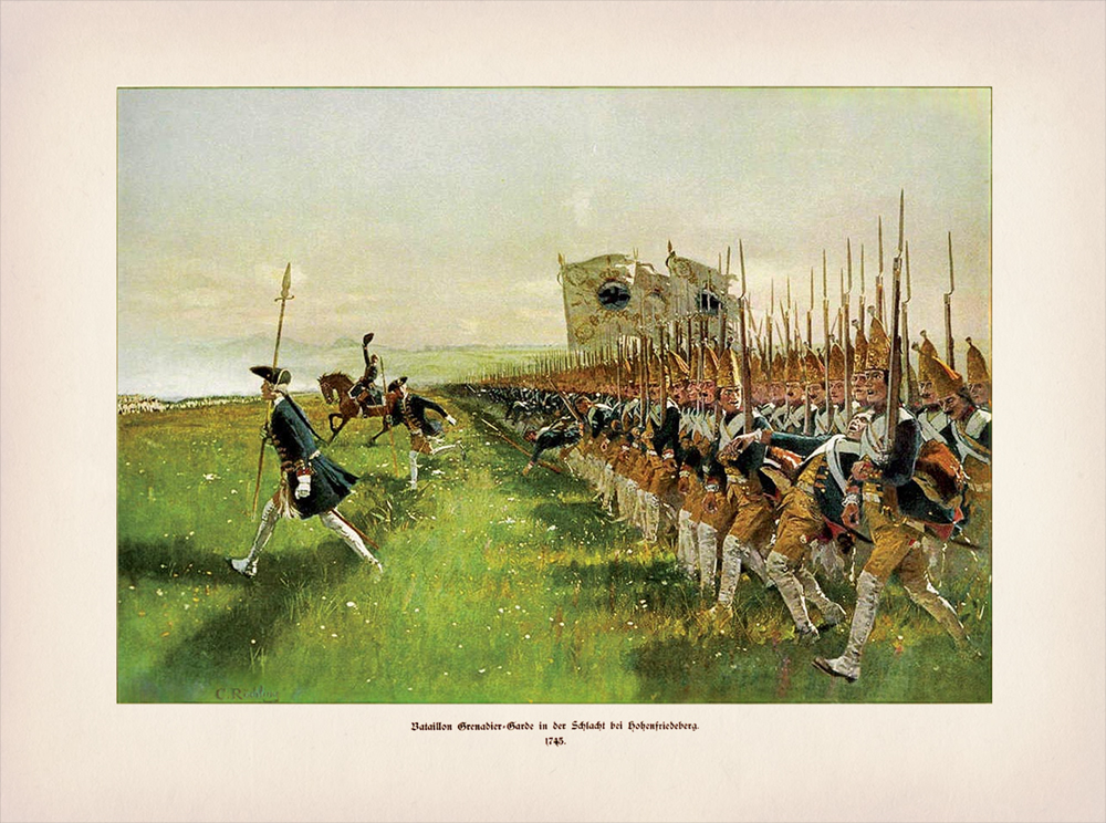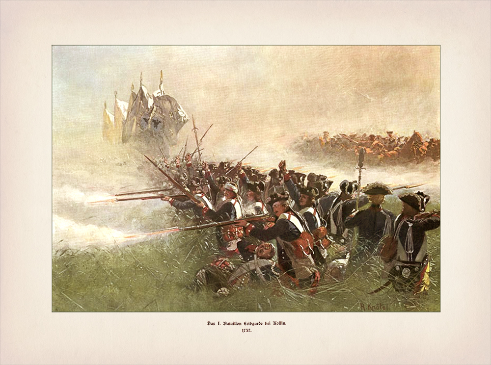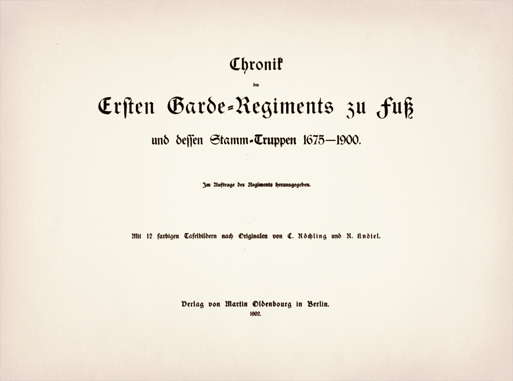 Die hier vorliegende "Chronik des ersten Garde-Regiments zu Fuß" ist für diese Art militärischer Gedenk-Bücher ein anschauliches Beispiel. Die "Im Auftrage des Regiments…" erstellte Ausgabe erschien lt. »Börsenblatt für den deutschen Buchhandel« vom 04. Juni 1902 in zwei Versionen; die Folio-Ausgabe mit 26 Seiten (13 Einzel-Blätter mit Titel und 12 Chromo-Lithografien von Gemälden der renommierten Schlachten-Maler und Uniformen-Kundler Richard Knötel und Carl Röchling) und eine 32-seitige Version (wohl in Einband-Bindung), die auch eine Kurz-Geschichte des Regiments und seiner Stamm-Truppen von 1675 bis 1900 in Form von drei Stamm-Tafeln enthielt. Beide Versionen wurden von dem in Berlin ansässigen Verlag Martin Oldenbourg im Format 41 x 31 cm veröffentlicht (ein Nachdruck mit 70 Text-Seiten wurde um das Jahr 2000 von der Saarbrückener Edition »Fines Mundi GmbH« im gebundenen Quer-Format angeboten). Reproduktionen der hier vorgestellten Kriegs- und Schlachten-Gemälde der beiden geschäfts-tüchtigen und auch privat eng miteinander befreundeten Maler – für ihr Schaffen in dem unter "wahren Künstlern" verachteten jedoch lukrativen Genre der Militär-Malerei von der Preussischen Akademie der Künste mit einer Professur ausgezeichnet – sind u.a. auch in den Werken