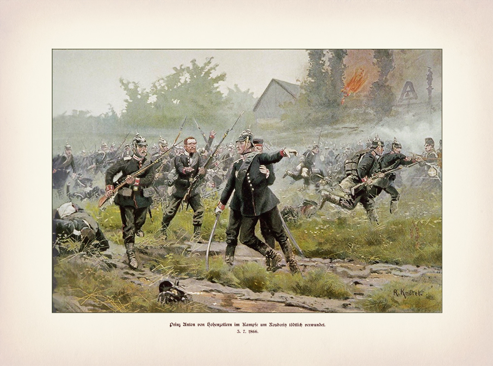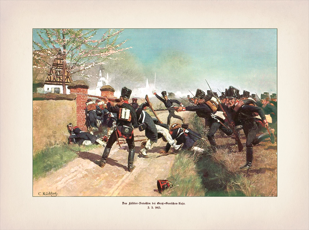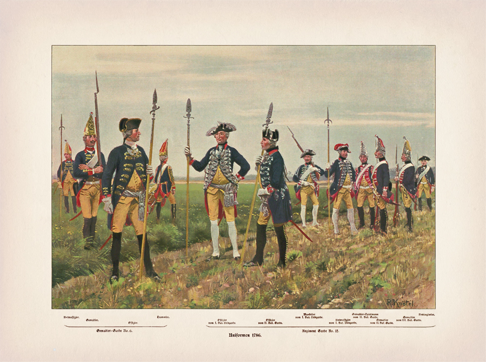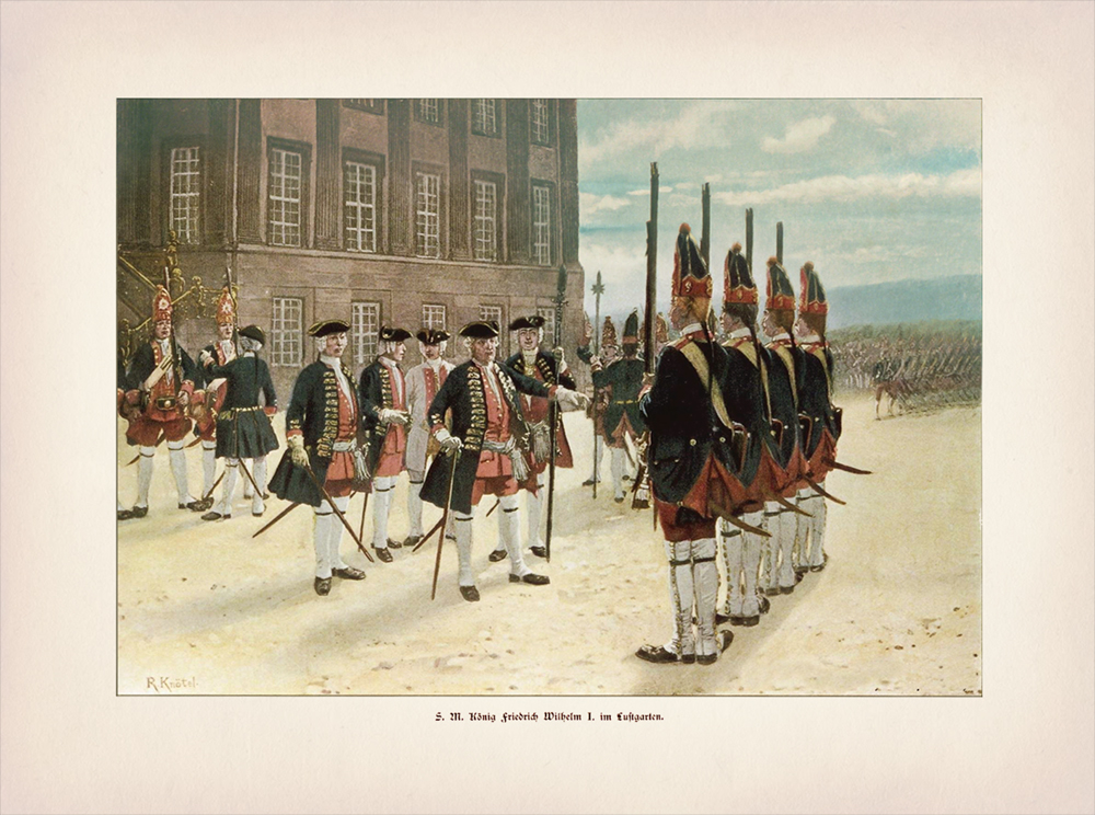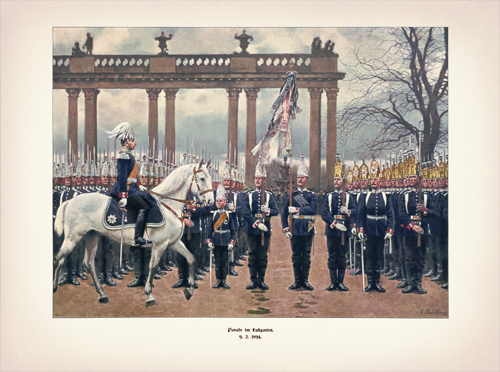 Über die Zahl der von Knötel, Röchling, Krickel u.a. deutschen Militär-Malern illustrierten Regiments-Geschichten und Jubiläums-Ausgaben gibt es keine Angaben; die Künstler lebten in einer Zeit, die vom militärischen Geist bestimmt wurde: National war das König-Reich Preussen auf dem Höhe-Punkt seiner Geschichte angekommen; hatte Deutschland geeint und stellte mit der Person des Kaisers die Vormacht im Reich; international war Preussen in seiner 200-jährigen Geschichte vom belächelten Klein-Staat zu einer europäischen Groß-Macht aufgestiegen und forderte um 1900 seinen "Platz an der Sonne", den die im Bau befindliche Hochsee-Flotte erkämpfen sollte. Der Sieg über Frankreich im Jahr 1871 – insbesondere die von Frankreich zu zahlenden Reparationen in Höhe von fünf Milliarden Gold-Francs (heute mehr als 162 Milliarden €uro) – hatten dem Deutschen Reich einen wirtschaftlichen Aufschwung beschert, der als sog. "Gründer-Zeit" in die Geschichte einging.