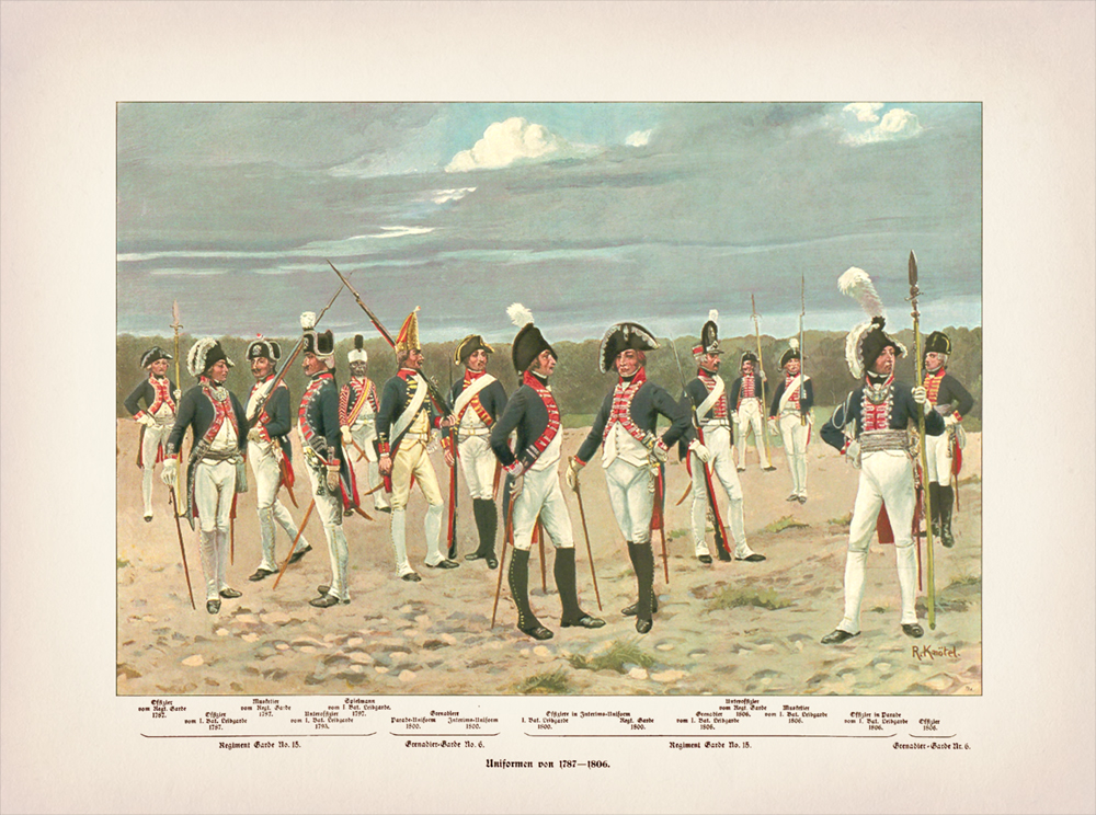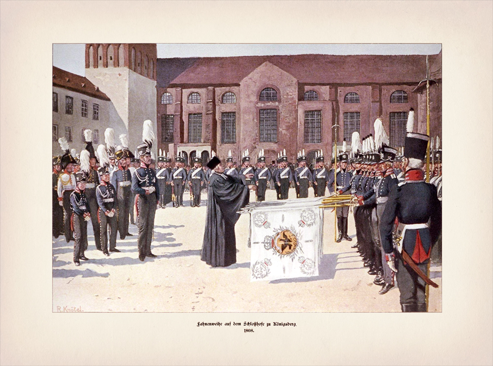 Infolge des Untergangs der alten preussischen Armee, die nach der Katastrophe von 1806 und dem Friedens-Vertrag von Tilsit von 1807 der Auflösung verfallen war, kam es zu zahl-reichen Neu-Errichtungen. Und obwohl viele der Regimenter, die zwischen 1807 und 1815 formiert worden waren, die Traditionen ihrer vorher-gehenden Stamm-Truppen übernommen hatten, standen viele Einheiten ab dem Jahr 1907 vor ihrem 100-jährigen Jubiläum. Dazu gehörte auch das mit A.K.O. vom 24. Januar 1807 in Memel gebildete 1te Garde-Regiment zu Fuß.