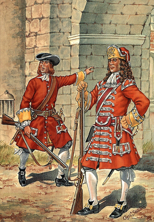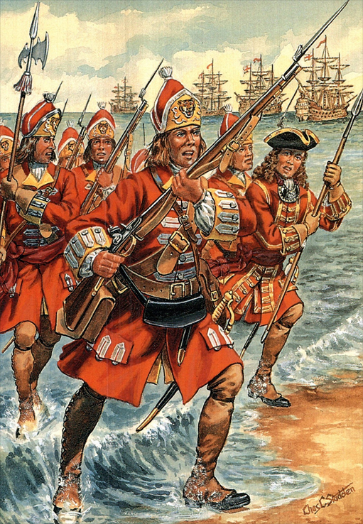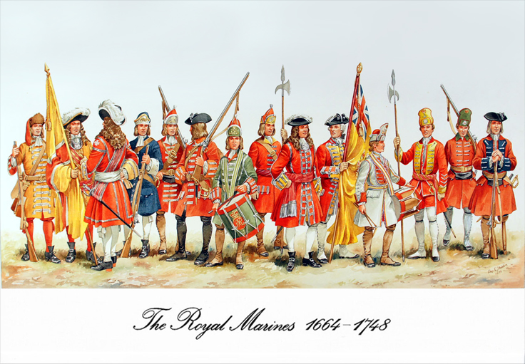 The First Marine Regiments 1664-1748. From left, Grenadier, Duke of York & Albany’s Maritime Regiment 1678; Ensign, Duke of York & Albany’s Lord High Admiral’s Regiment 1664; Prince George of Denmark’s Regiment of Foot 1686; Earl of Torrington’s Marines 1691; Grenadier, Holt’s Regiment of Marines 1702; Centinel, Earl of Donegal’s Regiment for Sea Service 1702; Drummer, Fox’s Marines 1704; Sgt, Villiers’s Marines 1712; Officer, Saunderson’s Marines 1710; Ensign, 1st Marines 1740; Drummer, 4th Marines 1742; Sgt, 2nd Marines 1748; Private, 6th Marines 1743; Private, Invalids 1740.