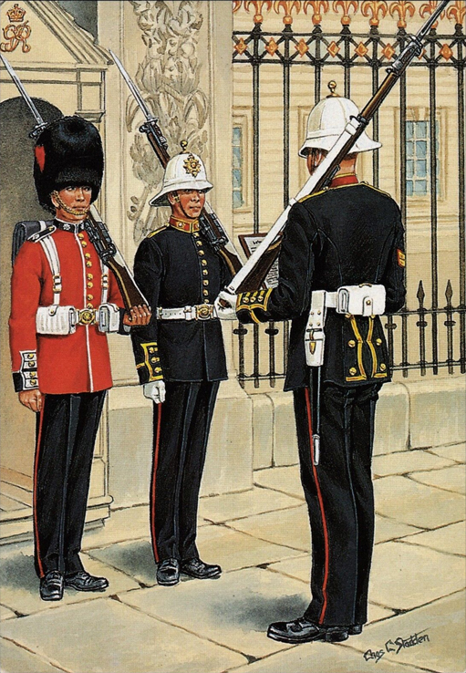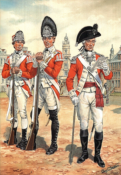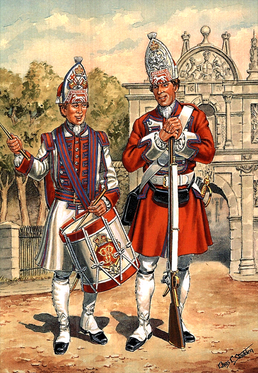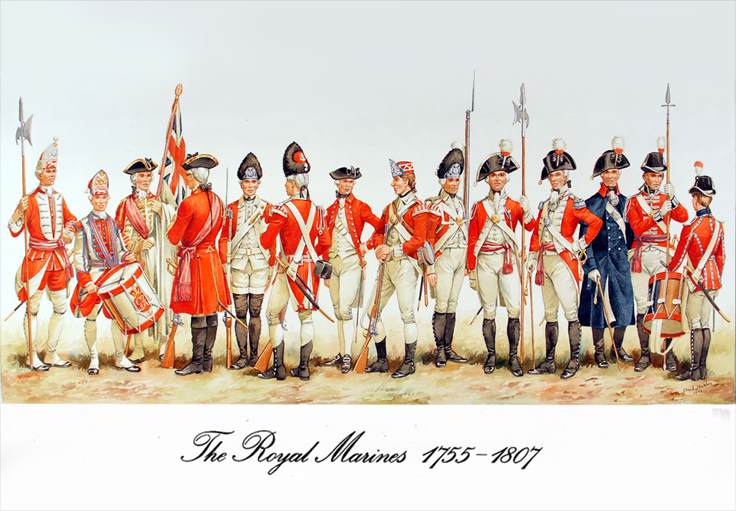 Marine Corps to Royal Marines 1755-1807: Sgt, The Marine Corps 1755; Drummer, 1758; Officer (with Colour) 1760; Officer (Grenadier Company), 1773; Grenadier, 1775; Sgt (Grenadier Company), 1780; Surg, 1773; Private, 1775; Grenadier, 1789; Sgt, 1790; Officer, 1795; Officer, (in Great Coat) 1798; Sgt, Royal Marines 1805; Drummer, Royal Marines 1807.