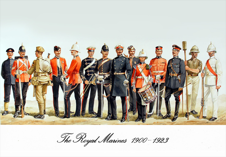Towards Amalgamation 1900-1923: Gunner RM Artillery (Working Dress) 1916; Cpl RM Light Infantry, Marching Order 1900; Private RM Light Infantry Khaki Marching Order 1917; Officer RM Light Infantry (Mess Dress) 1900; Officer RM Light Infantry (Review Order) 1908; Musn RM Artillery (Review Order Lap) 1910; Officer RM Artillery (Review Order) 1900; Officer RM Artillery (Undress) 1922; Officer RM Artillery Mess Dress) 1900; Drummer RM Light Infantry Review Order 1922; Officer RM Light Infantry Drill Order) 1904; Field Officer RM Artillery Drill Order) 1914; Gunner RM Artillery SW Africa) 1917; SNCO RM Light Infantry Tropical Dress 1900.