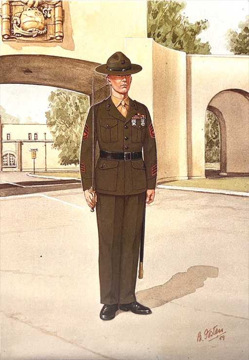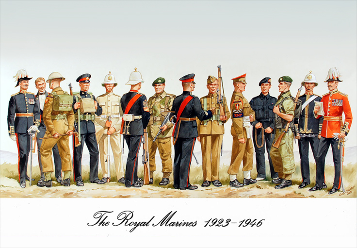 From Sea Soldiers to Commandos 1923—1946: Col Commandant (Review Order) 1928; Field Officer (Mess Dress) 1939; Officer (Fighting Order) 1941; Marine (Embarkation Order) 1938; Cpl Khaki Drill, (Review Order) 1939; C/Sgt (Review Order) 1935; Marine RM Commando (NW Europe) 1944; QMSI First Drill) (Drill Order) 1938; Recruit Khaki, Drill Order) 1939; Cpl RM Provost Coy 1943; Marine Blue Battledress 1944; Marine RM Commando Far East 1945; Musn RM Divisional Band Review 1935; General Officer, Review Order 1935.