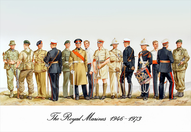 Royal Marines Commandos 1946-1973: Marine (Malaya) 1951; Cpl (Southern Arabia) 1964; Officer (Service Dress) 1946; RSM (No 1 Dress) 1969; Cpl (Lovat Dress) 1969; C/Sgt (Greatcoat) 1948; SNCO (Tropical Mess Dress) 1959; Musn (Tropical Dress) 1960; Officer (Khaki Drill) 1960; Adjutant (Blue Uniform) 1956; Drummer (Review Order) 1969; Officer (Red Sea Rig) 1959; General Officer (Ceremonial Dress) 1964; Marine (Combat Dress) 1969.
