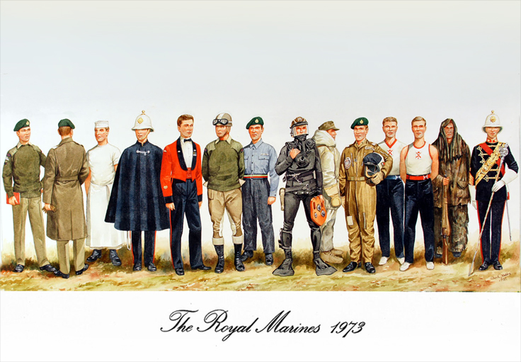 The Royal Marines in 1973: Cpl, Barrack Working Drew – Jenev Wool Heavy; Sgt, Lovat Dress – RM Raincoat; Cook, Working Dress; Musn, Ceremonial Blue Dress, with Blue Band Cape; WO, Mess Dress; Despatch Rider, Working Dress; Naval Working Dress; Swimmer Canoeist; Cold Weather Warfare Dress; Sgt, Light Aircraft Pilot; PTI, PT Sweater; Stall PTI, PT Vest; Sniper; Drum Major, Ceremonial Blue Dress.