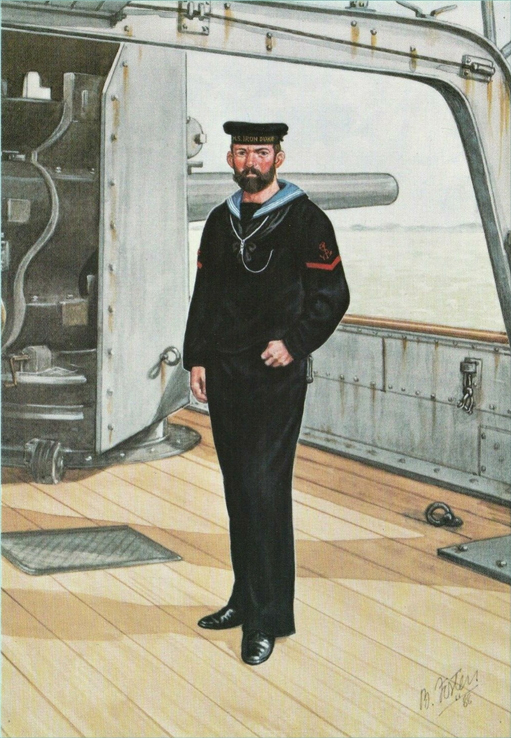 The blue was adopted for the artillery in 1805 because of the ‘great injury which the uniform clothing of the companies suffered from the powder when at gun and mortar practice; it was easier to maintain in the dirty environment of working the ships guns – the first real step towards a practical working uniform.