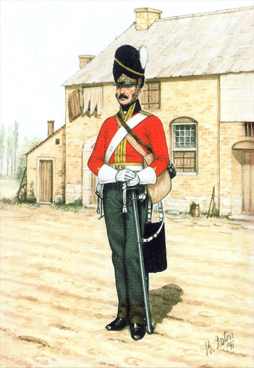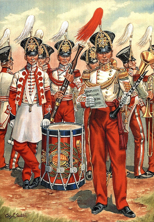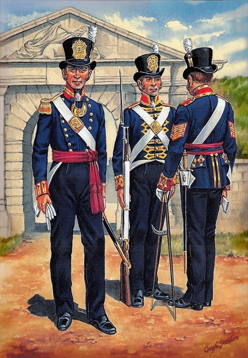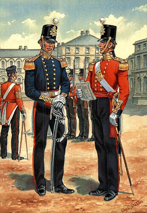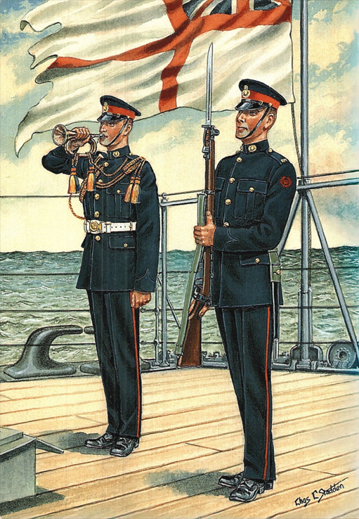Artillery Companies and Royal Marines 1807-1854: Private, RM Artillery (Blue Undress) 1807; RM Artillery (Full Dress) 1807; RM (Frock Uniform) 1815; RM Artillery (Full Dress) 1817; RM (Full Dress) 1823; RM (Drill Order) 1830; Trumpeter, RM Artillery (Full Dress) 1830; Drummer, RM (Full Dress) 1829; Officer, RM (Undress Frock) 1833; Officer, RM (Serving Afloat) 1838; Bandsman, RM (Full Dress) 1825; Officer, RM Artillery (Full Dress) 1848; Private, RM (Marching Order) 1854; Bombardier, RM Artillery (Undress, Crimea) 1854.