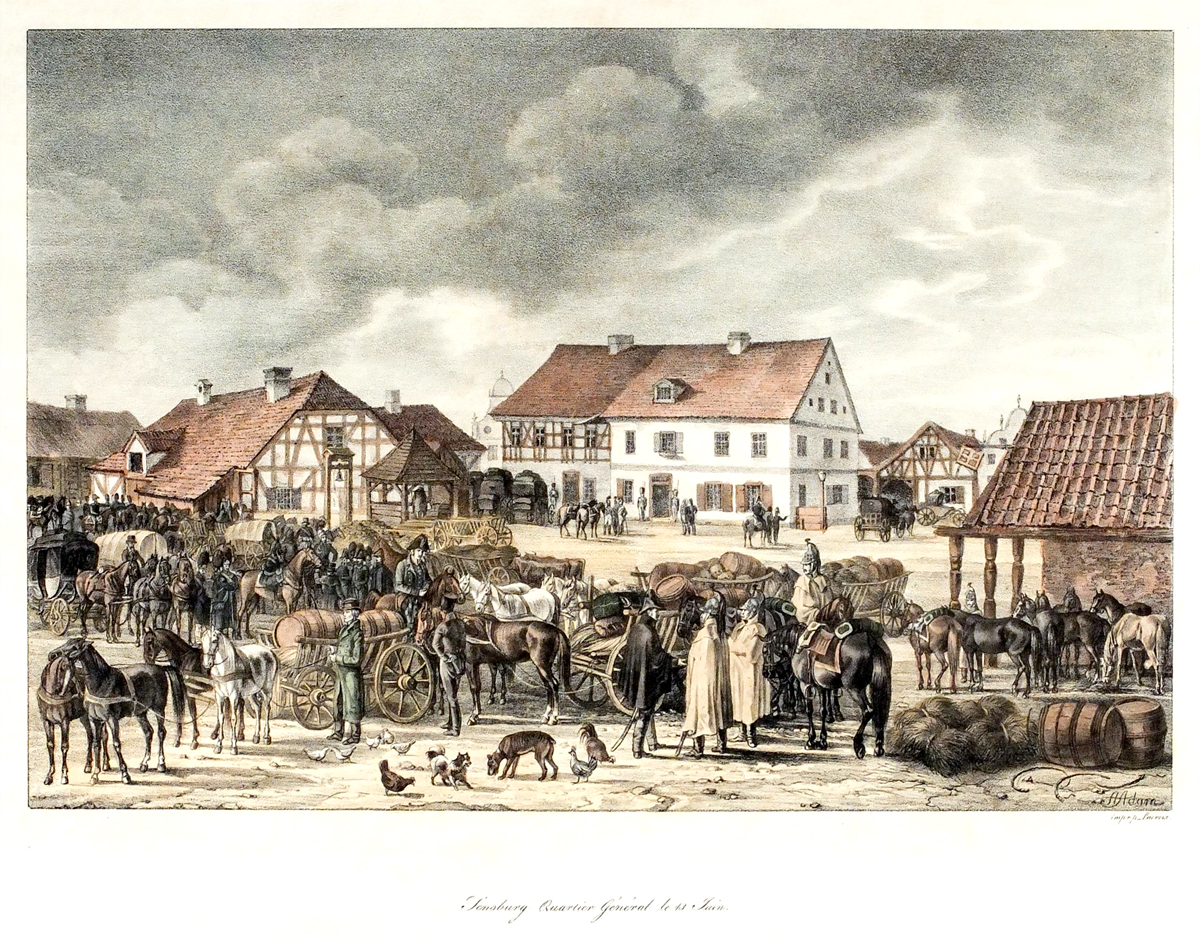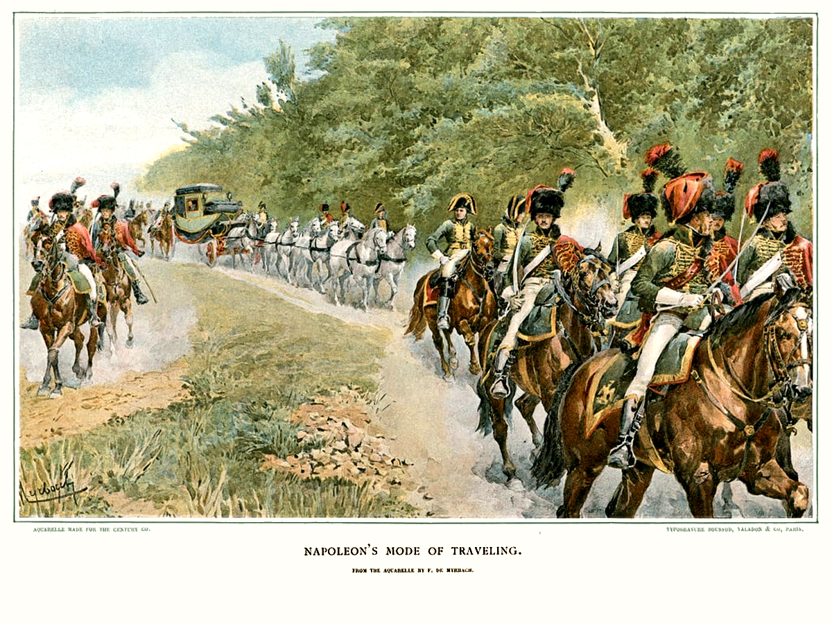 Eskortiert von den Jägern zu Pferd seiner Garde verließ Napoleon am 9. Mai 1812 Paris, passierte am 11. Mainz und am 13. Frankfurt.