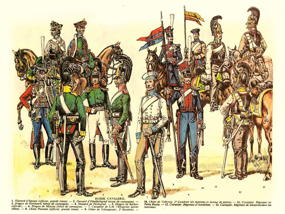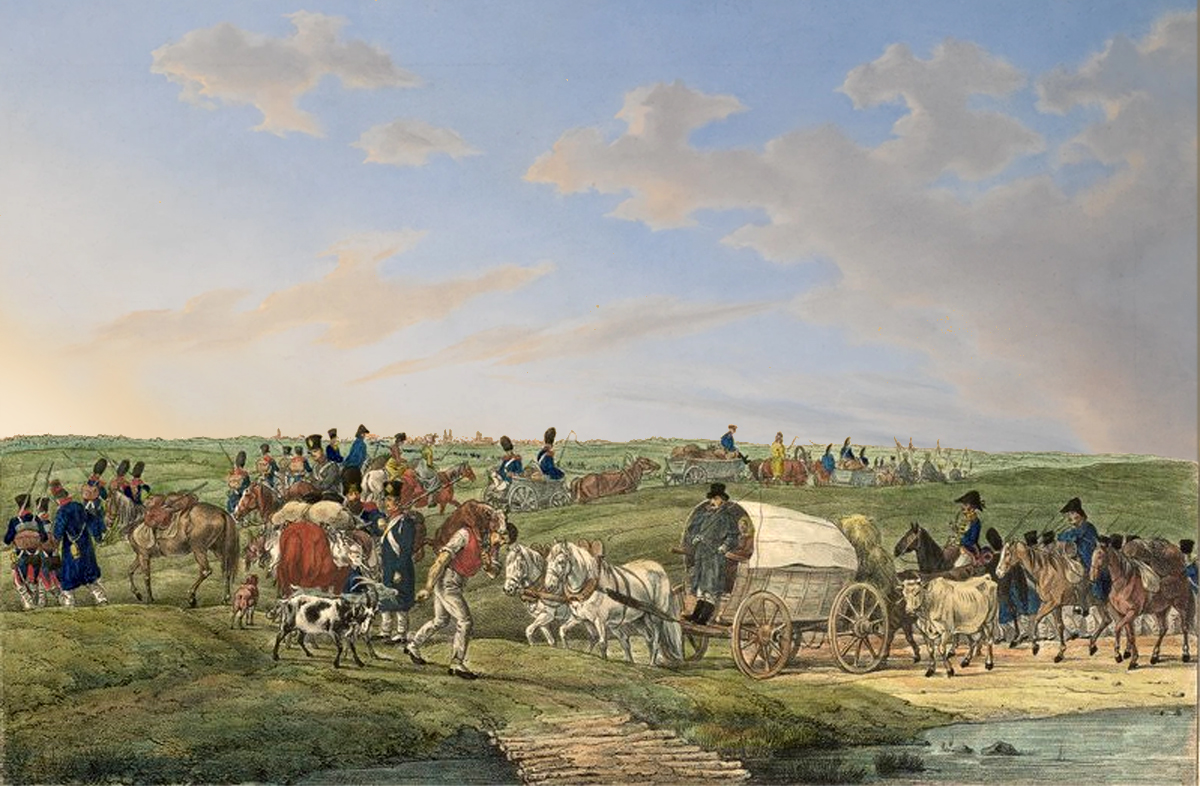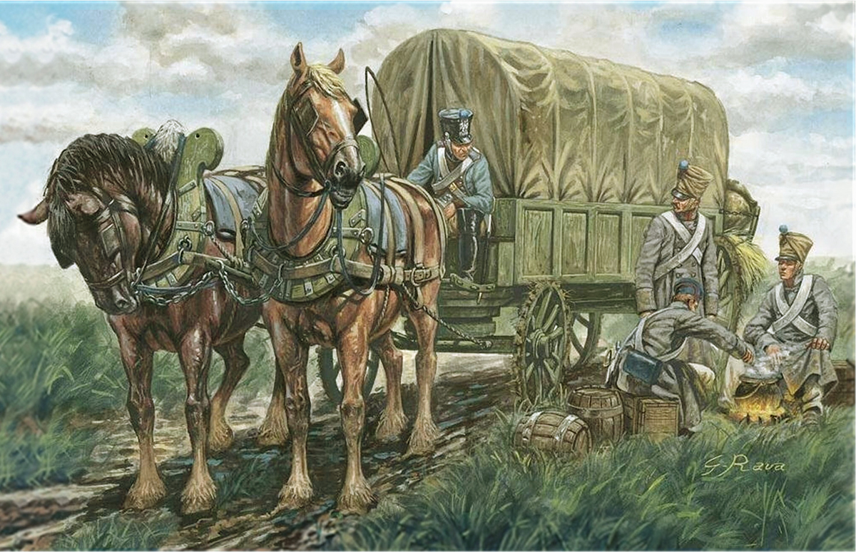 Tatsächlich verlangten schon die rund 1.000 Offiziere des Großen Haupt-Quartiers und des hier zugehörigen "Maison de l'empereur" etwa 2.000 Reit- und Zug-Tiere für die umfangreiche Bagage. Rund 95.000 Pferde führten die Kavalleristen aller Waffen-Gattungen ins Feld, die bis zum Herbst hier auch ihr Futter finden sollten. Für die Geschütze sowie die Pulver- und Munitions-Wagen der Erst-Ausstattung waren 18.000 Pferde nötig; weitere 12.000 Pferde waren für die Werkzeug- und Geräte-Wagen des Artillerie-Fuhrparks, der Pionier- und der beiden Pontonier-Bataillone erforderlich. Zusammen mit den Zug-Tieren der Transport-Einheiten der einzelnen Armee-Corps und dem "Bataillon des Train de la Garde" sowie der 26 Equipage- bzw. Train-Bataillone der Armee, die mit über 6.000 Transport-Wagen – erfasst waren 7.848 Fuhr-Werke aller Art – eine Lade-Kapazität von knapp 10.000 Tonnen pro Tour besaßen, gehen Schätzungen davon aus, dass die "Grande Armée" von mindestens 200.000 Pferden begleitet wurde (erwähnenswert dabei Herden von weit mehr als 50.000 Stück Schlacht-Vieh, die teilweise auch als Zug-Tiere Verwendung finden sollten, jedoch mangels Futter und Pflege rasch abmagerten und zum größten Teil schon in den ersten zwei Wochen am Straßen-Rand verendeten).