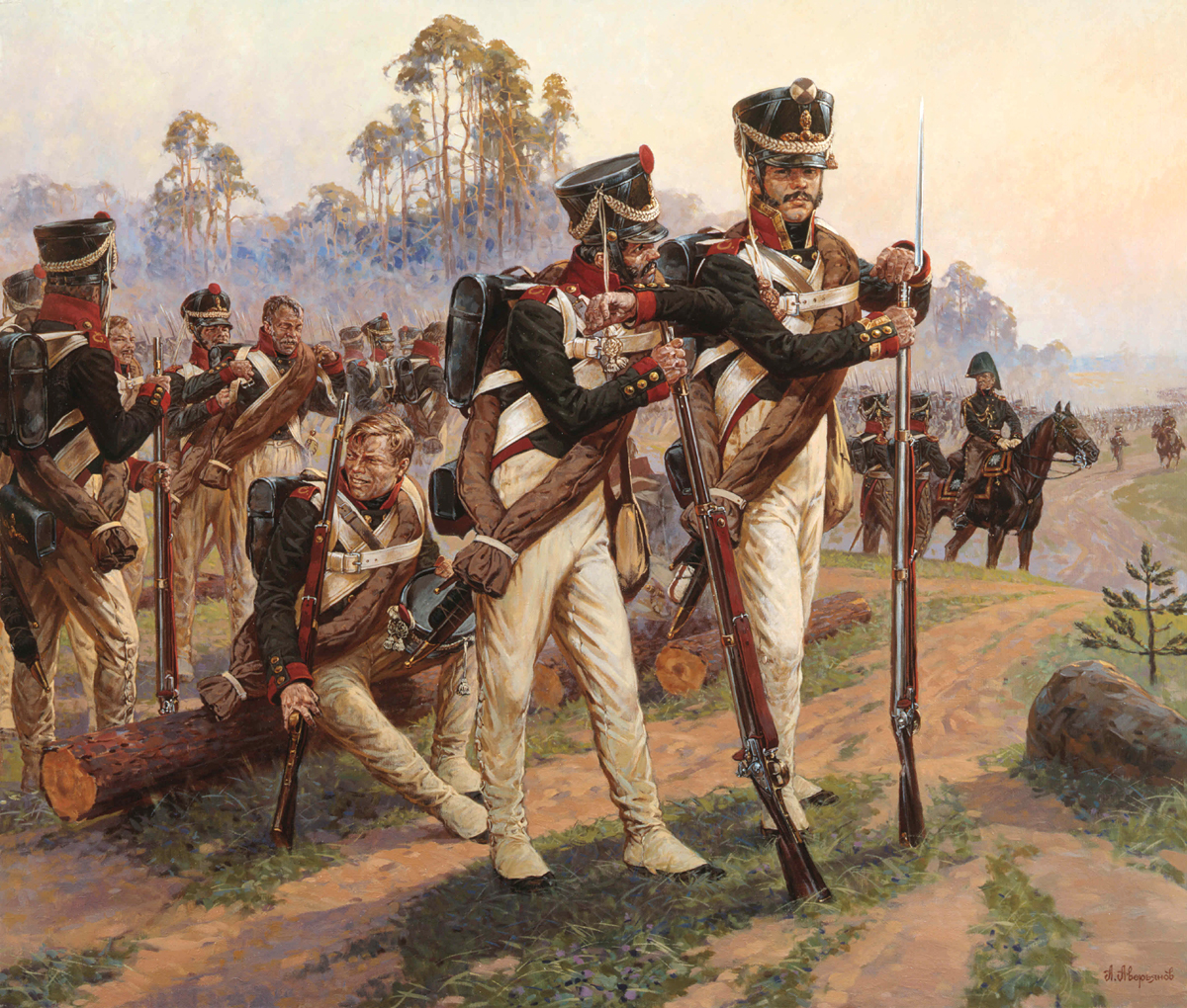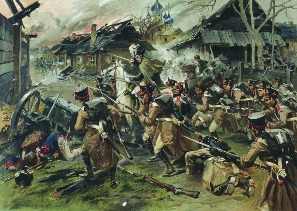 Am Morgen des 24. Oktober eröffnet Oberst Vuich, Kommandeur des 19ten Jäger-Regiments, den Angriff auf französische Avant-Garde vor Malojaroslawez und damit die Schlacht um die Stadt. Im Bild-Mittelpunkt ist Pater Wassili Wassilkowsky dargestellt. Der populäre Priester des Regiments, dessen Stimme den Donner der Kanonen übertönen konnte, wurde bereits bei Witebsk, Smolensk und Borodino schwer verwundet. Auch bei Malojaroslawez blieb er an der Seite der Soldaten und umsorgte anschließend die Verwundeten.