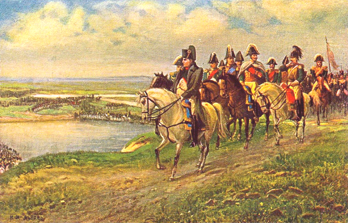 "Napoleon und Alexander I. beim Treffen in Tilsit." Illustration von Alexei Kiwschenko aus dem Album zum Roman des Grafen L. N. Tolstoi "Krieg und Frieden", 1893. Bildquelle: ► WIKIPEDIA.