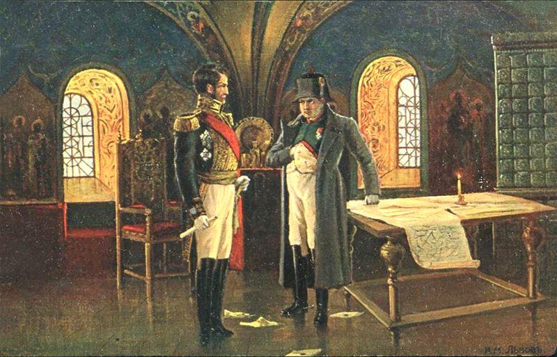 Nach der Niederlage in der Schlacht bei Friedland am 14. Juni 1807 hatte der russische Zar Alexander I. mit Kaiser Napoleon am 7. Juli 1807 den für das russische Offiziers-Korps als auch für große Teile des russischen Adels demütigenden Frieden von Tilsit geschlossen. Zwar beinhaltete der "Freundschafts-Vertrag unter Gleichen" eine von beiden Seiten detailliert abgestimmte Aufteilung der Welt in eine französische und eine russische Interessens- und Einfluss-Zone, doch war für die meisten deutschen bzw. russischen Verwandten des Zaren, die über deutsche Klein- und Kleinst-Staaten herrschten, die grundsätzliche Anerkennung des Rhein-Bundes -, die territoriale Halbierung Preussens (wobei Russland ohne Zögern Napoleons Angebot angenommen hatte, große Teile der im Rahmen der dritten Teilung Polens an Preussen gegangenen Provinz Neu-Ostpreussen zu annektieren) -, vor allem aber das neu gegründete Herzogtum von Warschau nicht akzeptabel. Besonders umstritten waren einige geheime Zusatz-Vereinbarungen, in denen die russischen Pläne, die von Schweden besetzten Teile Finnlands zu erobern, von Napoleon nur gebilligt wurden, so Russland eine "immerwährende" Neutralität erklären und sich von nun an aus sämtlichen Entwicklungen innerhalb Zentral-Europas und an der Adria heraushalten würde (für die Souveränität einiger Klein-Staaten hatte Russland seine mediterranen Handels- und Hafen-Städte im Ionischen Meer an Frankreich abtreten müssen).