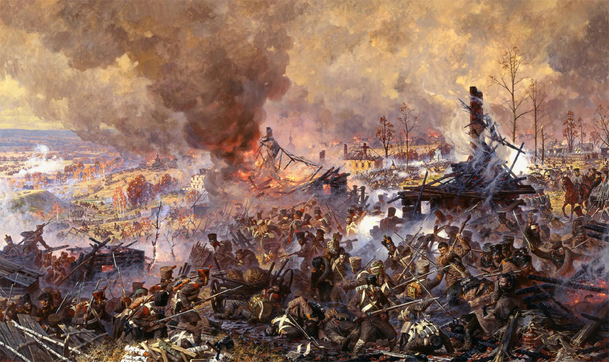 Auf dem Marsch in Richtung der süd-westlich von Moskau gelegenen Gouvernements-Hauptstadt Kaluga, in der Napoleon das Winter-Quartier und ausreichend Proviant zur Versorgung seiner Armee zu finden hofft, werden die rund 20.000 Mann des IV. (italienische) Corps unter Vize-König Eugène de Beauharnais, die die Avant-Garde der französischen Haupt-Armee bilden, am frühen Morgen auf der Straße von Moskau nach Brjansk bei Malojaroslawez überraschend von russischen Truppen angegriffen. Obwohl es Beauharnais gelingt, die 13te und 14te Division seines Corps schnell heranzuführen und die leichten Jäger-Bataillone des russischen Reiter-Generals Matwej Iwanowitsch Platow aus der Stadt zu jagen, bleibt der weitere Weg versperrt: Ständig beobachtet von Platows Kosaken ist Feld-Marschall Kutusow über die Bewegungen der französischen Armee bestens informiert. Vorausschauend hatte er dem erfahrenen und taktisch geschickt agierenden General-Leutnant Dmitri Sergejewitsch Dochturow befohlen, den weiteren Vorstoß der Franzosen nach Süd-Westen zu verhindern und die "Grande Armée" bis zum Eintreffen der russischen Haupt-Armee mit den rund 15.000 Mann seines IV. Korps aufzuhalten. Diesem Befehl entsprechend, hat Dochturow hinter Malojaroslawez eine provisorische jedoch gut befestigte Abwehr-Stellung errichten lassen, aus deren Rückhalt wiederum seine Regimenter im Gegen-Angriff die französisch-spanisch-kroatischen Truppen aus der an vielen Stellen in Brand geratenen Stadt werfen.