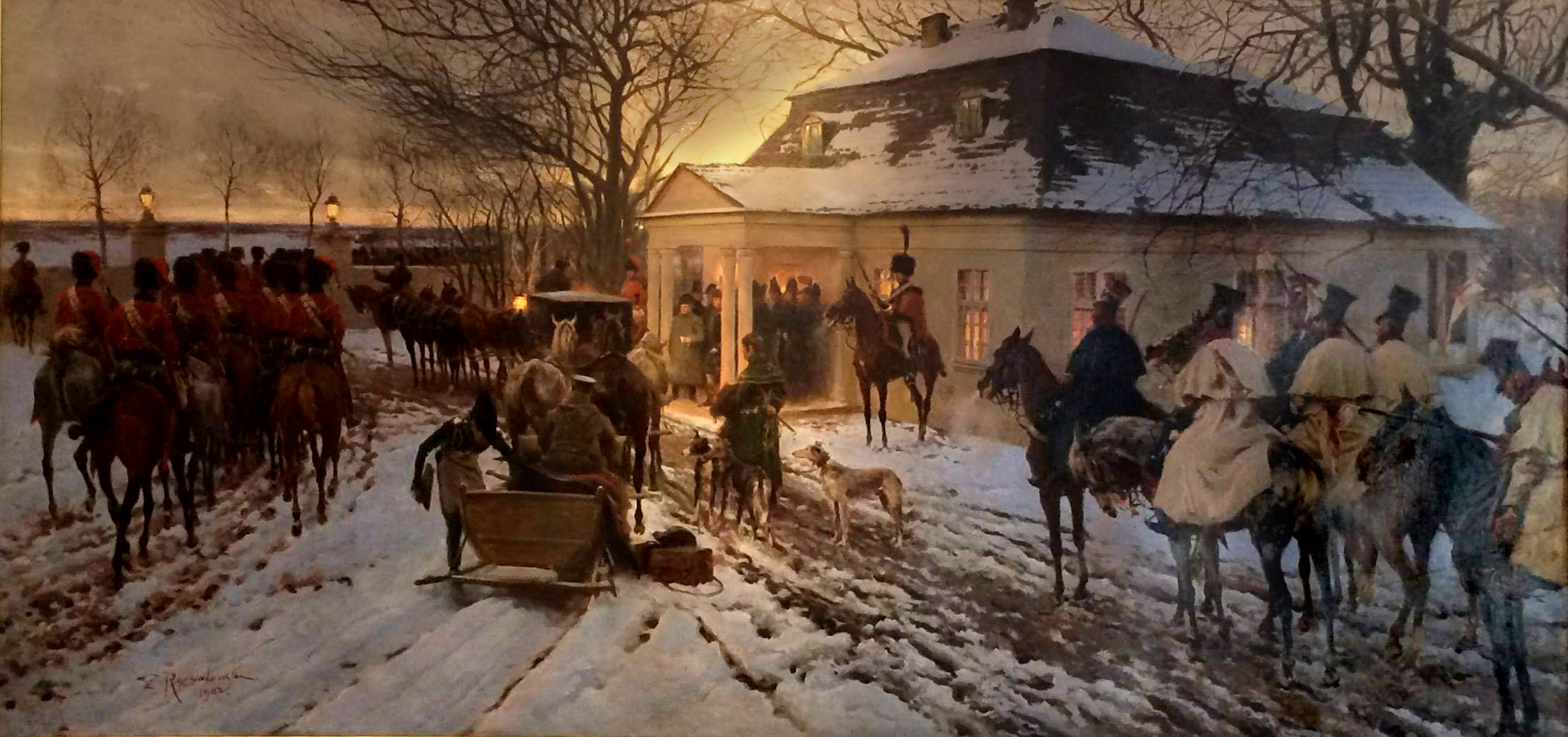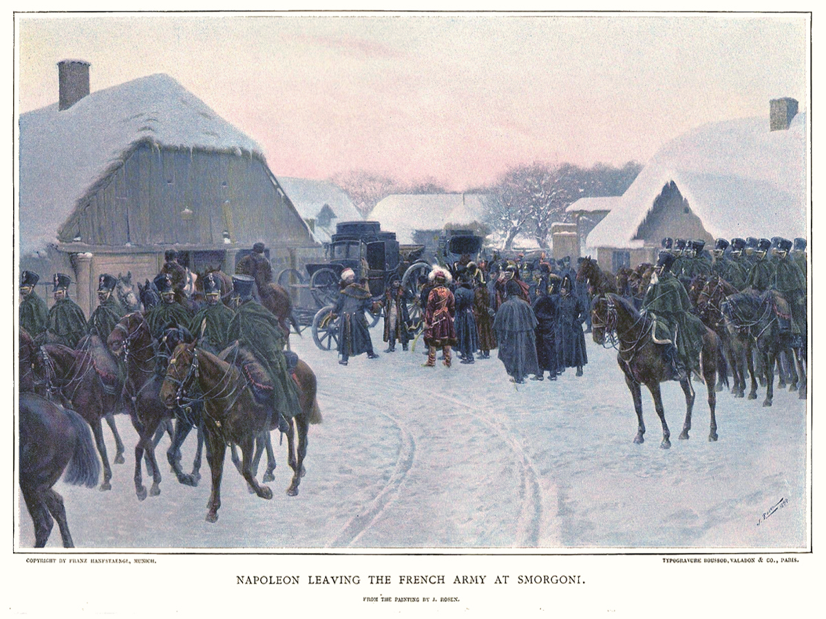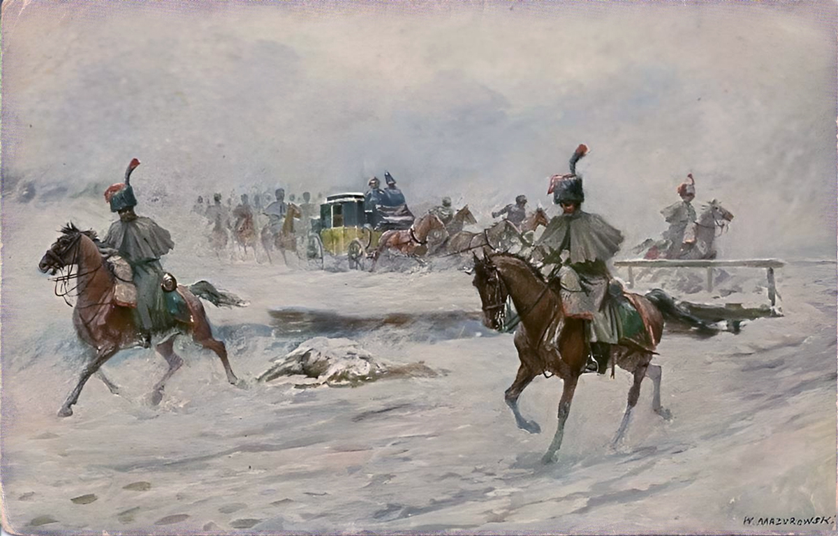 Bei 33 Grad Frost -, begleitet von den Generälen Géraud Christophe Michel Duroc, Armand-Augustin-Louis de Caulaincourt, Charles Lefebvre-Desnouettes und Georges Mouton de Lobau sowie seinem Diener und Leib-Wächter Rustam -, eskortiert von einem 30 Mann starken Zug der Jäger zu Pferd seiner Garde und geführt und gesichert von einem weiteren Zug der Chevau-legers Lanciers der Garde unter Leutnant Stanislaw Dunin-Wasowicz fährt Napoleon in seiner beheizbaren Kutsche über die Chaussee nach Oschmjany (heute Aschmjany, BLR) in Richtung Westen.