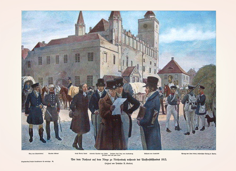 "Vor dem Rathaus auf dem Ringe zu Reichenbach während des Waffenstillstandes 1813." (Waffenstillstand von Pläswitz: 4. Juni bis 20. Juli 1813; später bis zum 10. August 1813 verlängert) Illustration von Prof. Richard Knötel.