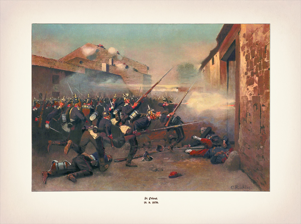 Über die Zahl der von Knötel, Röchling, Krickel u.a. deutschen Militär-Malern illustrierten Regiments-Geschichten und Jubiläums-Ausgaben gibt es keine Angaben; die Künstler lebten in einer Zeit, die vom militärischen Geist bestimmt wurde: National war das König-Reich Preussen auf dem Höhe-Punkt seiner Geschichte angekommen; hatte Deutschland geeint und stellte mit der Person des Kaisers die Vormacht im Reich; international war Preussen in seiner 200-jährigen Geschichte vom belächelten Klein-Staat zu einer europäischen Groß-Macht aufgestiegen und forderte um 1900 seinen "Platz an der Sonne", den die im Bau befindliche Hochsee-Flotte erkämpfen sollte. Der Sieg über Frankreich im Jahr 1871 – insbesondere die von Frankreich zu zahlenden Reparationen in Höhe von fünf Milliarden Gold-Francs (heute mehr als 162 Milliarden €uro) – hatten dem Deutschen Reich einen wirtschaftlichen Aufschwung beschert, der als sog. "Gründer-Zeit" in die Geschichte einging.