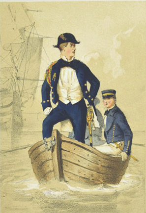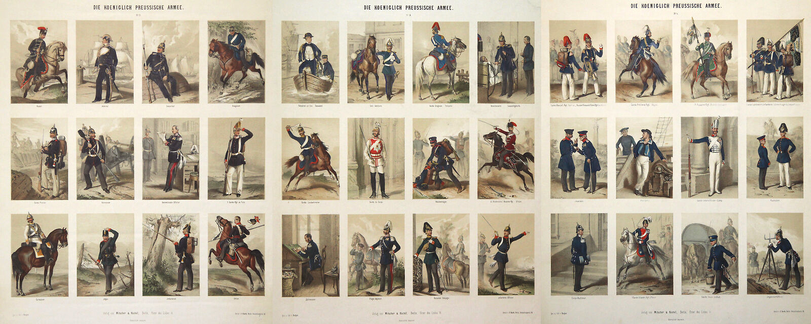 Ludwig Burger (1825 - 1884) zur Uniformierung der preussischen Armee, die auf 48 hand-kolorierten Tafeln im Oktav-Format (4 x 6 rheinl. Zoll; etwa 105 x 157 mm), einzeln aufgezogen auf ca. 185 x 225 mm große Bütten-Karton-Bogen, das Erscheinungs-Bild von Generalität, Garde-, Linien- und Landwehr-Truppen, Marine und Militär-Beamten nach dem »Reglement über die Bekleidung der Truppen im Frieden« (siehe dazu