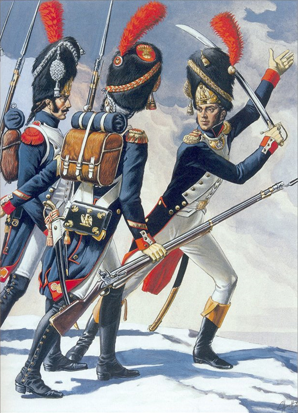 Grenadiere zu Fuß (Garde Imperiale). Gefreiter, Sergeant und Offizier. 1805-1806. |