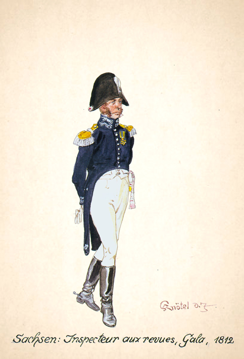 Maréchal de l'Empire, 1812.Der "Marschall" war kein militärischer Dienst-Grad sondern ein Ehren-Titel, der vom Kaiser an hervorragende Divisions-Generäle verliehen wurde. Zusammen mit wesentlich höheren Bezügen, besonderen Privilegien und die Erhebung in eine von Napoleon neu geschaffene Adels-Schicht war der Marschalls-Stab, der an beiden Enden mit Goldkappen versehen und mit blauem, mit goldenen Adlern besticktem Samt überzogen war (verkürzte Form des mittelalterl. Hofmarschall-Stabes) schon zu Zeiten der Monarchie Insigne eines Armee- bzw. Corps-Kommandanten der französischen Armee. Der hier dargestellte Marschall trägt eine Gala-Uniform mit einer schönen Auswahl französischer und ausländischer Auszeichnungen. Die rote Kordon auf seiner Brust weist darauf hin, dass ihm das "Groß-Kreuz" verliehen wurde; der höchste Grad der Ehren-Legion. Seine weiß-goldene Schärpe ist das sichtbarste Abzeichen eines Marschalls; seine Adjutanten trugen häufig gleich-artige Arm-Binden.